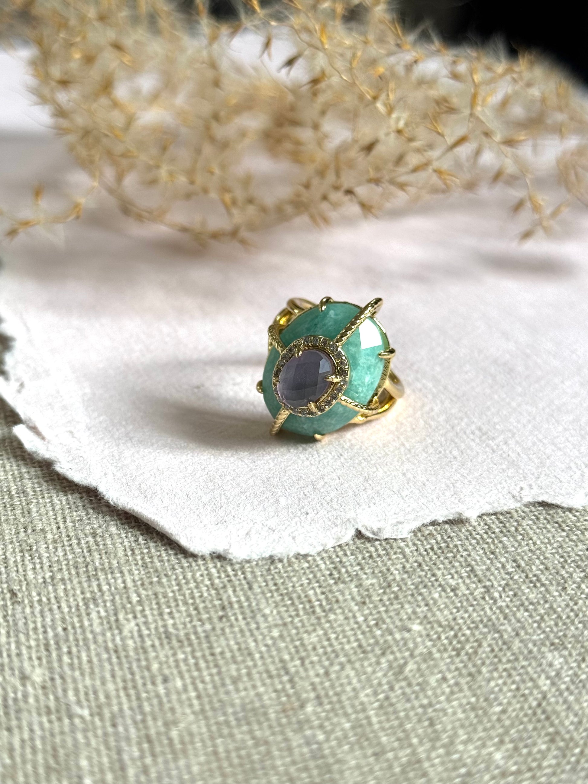 Bague en laiton doré à l'or fin, amazonite, améthyste et strass