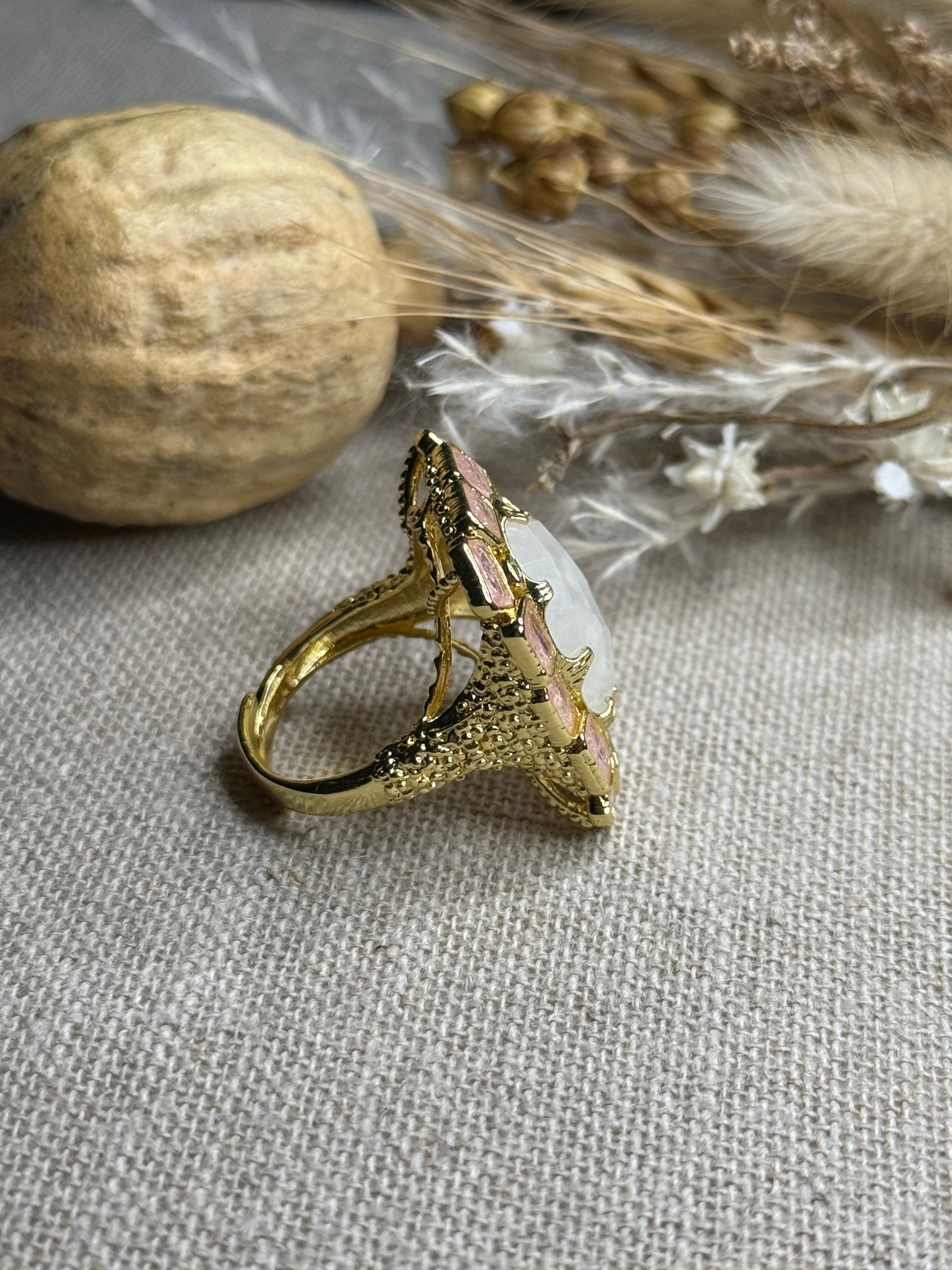 Bague en laiton doré à l'or fin, cristal de roche entouré de quartz rose et de zircons blancs
