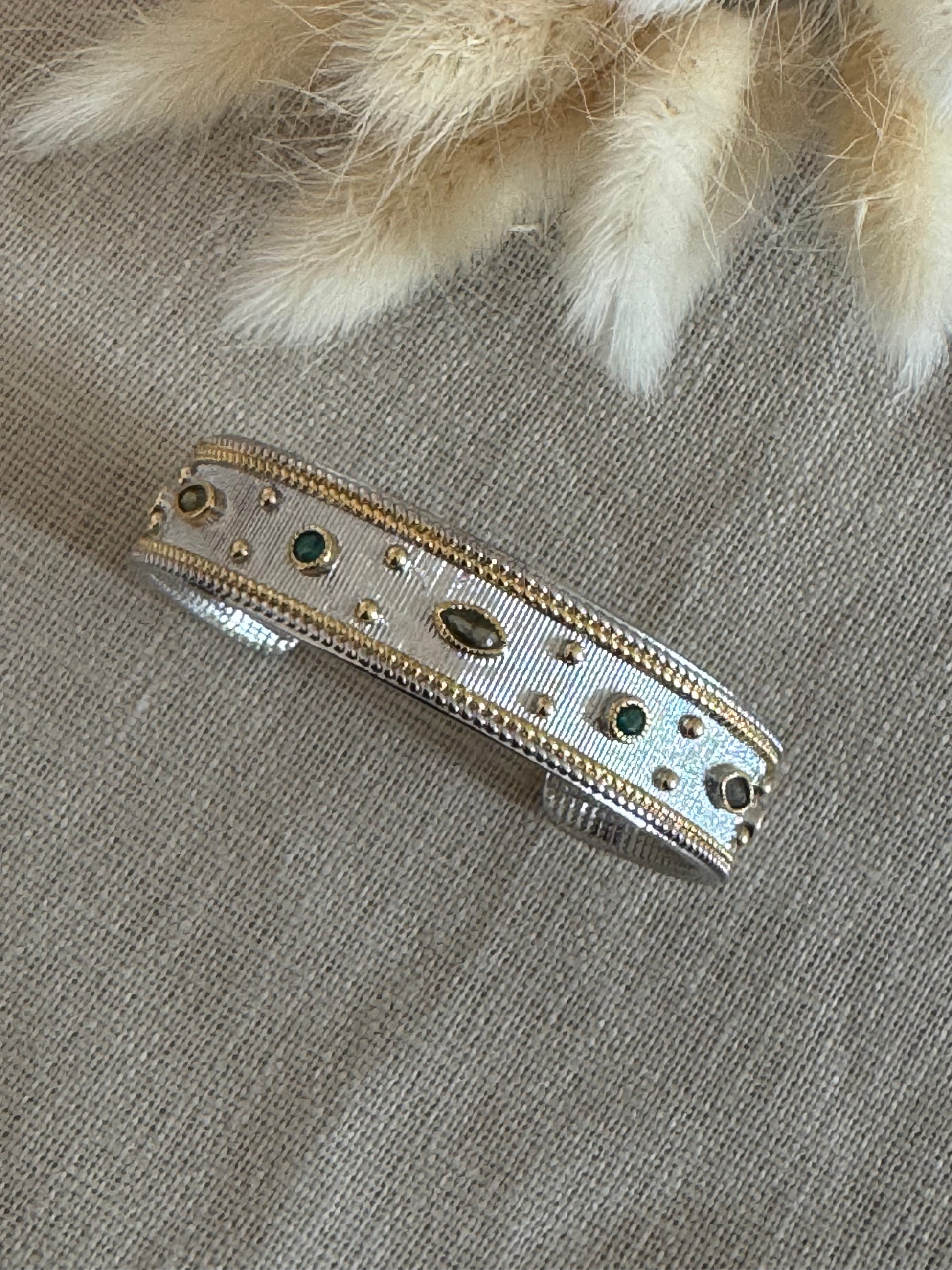 Bracelet jonc en métal argenté et doré avec zircons verts et marrons