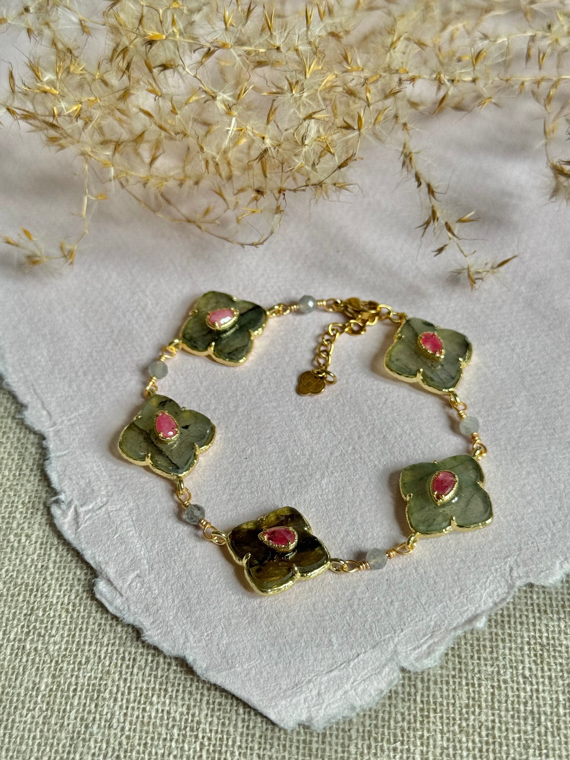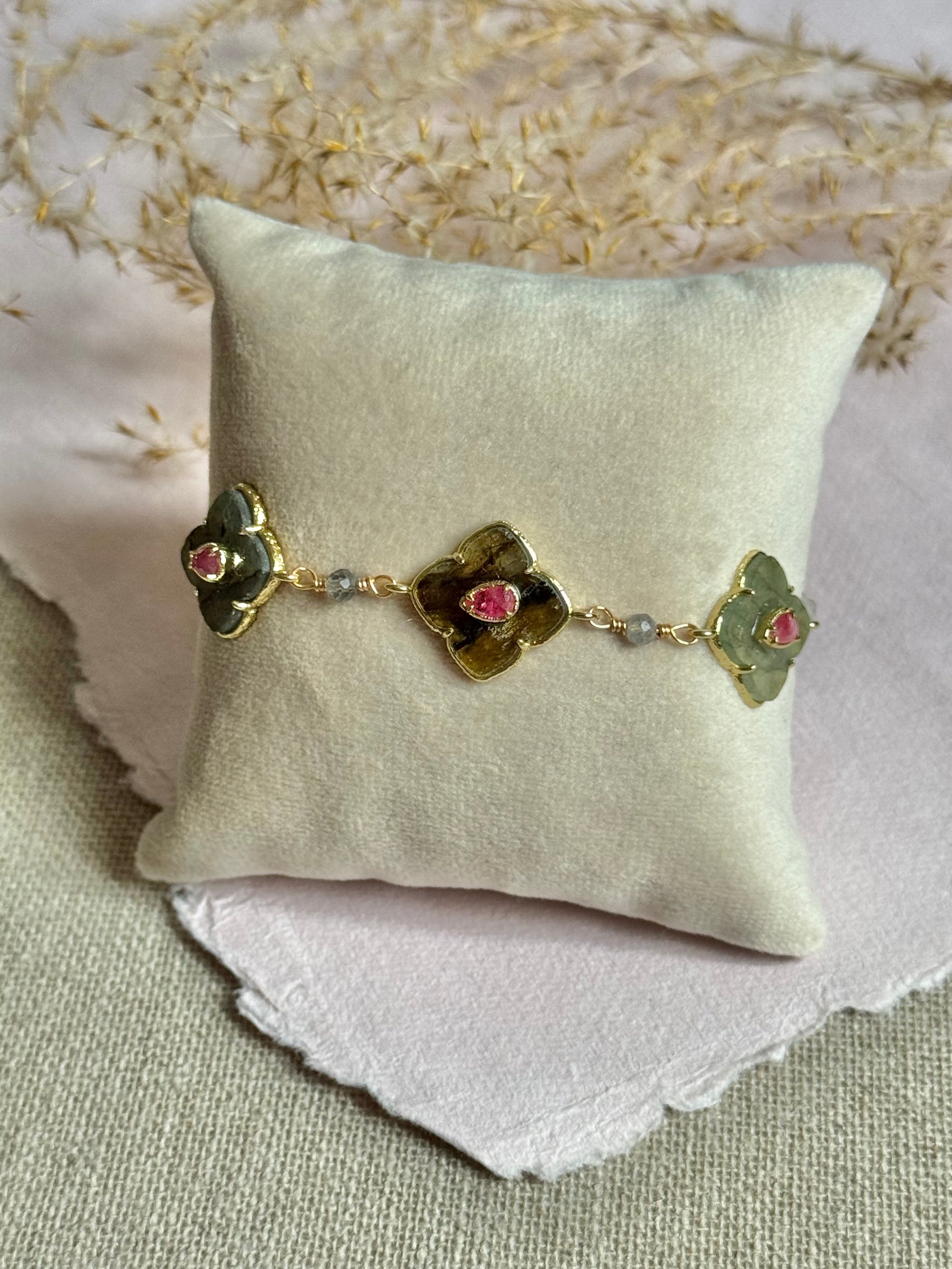 Bracelet en laiton doré à l'or fin et pendentifs trèfles labradorites sertis d'une tourmaline