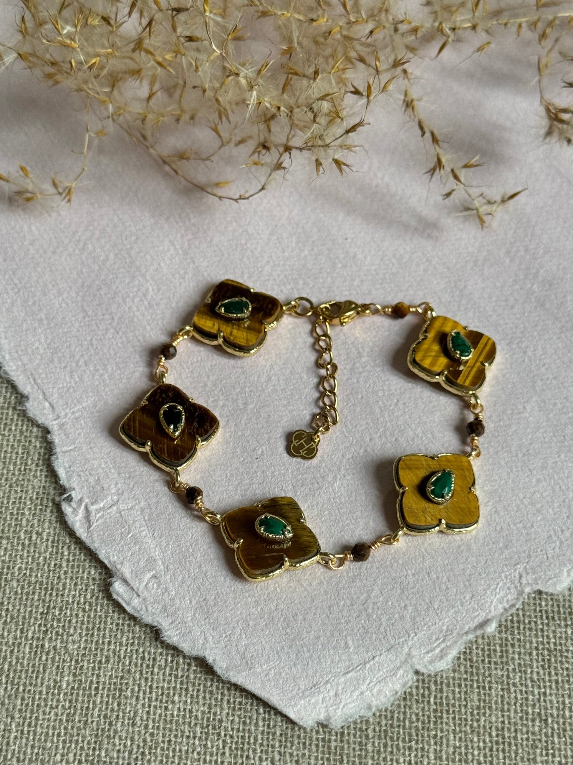 Bracelet en laiton doré à l'or fin et pendentifs trèfles oeil de tigre sertis d'une malachite