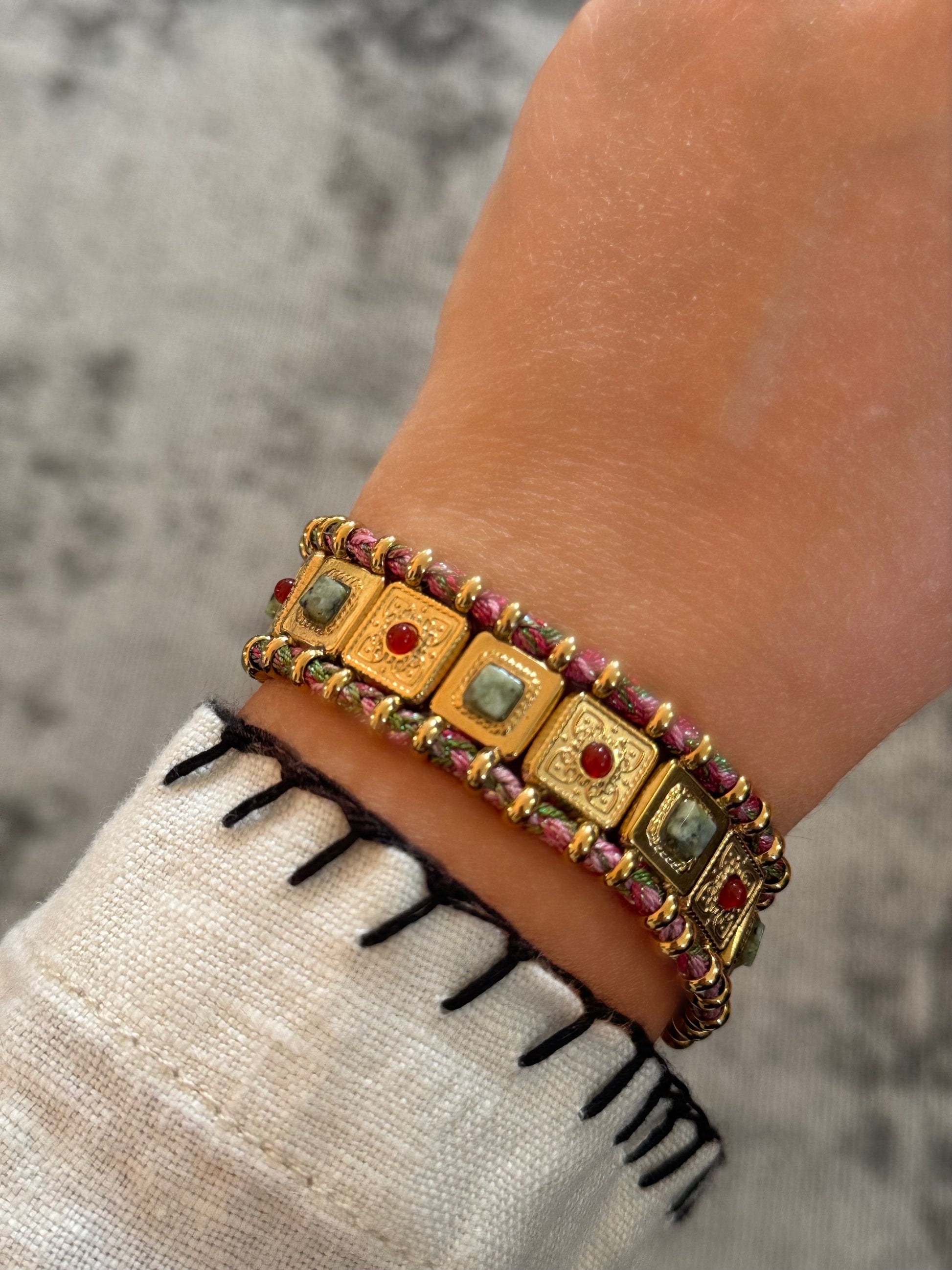 Bracelet composé de médailles en acier inoxydable doré sur cordon rose et vert.