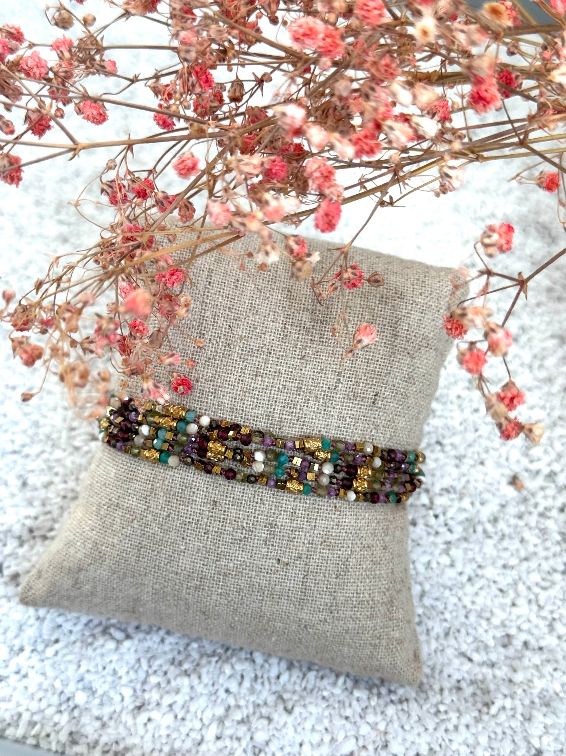Bracelet 5 rangs composé de pierres naturelles turquoise, violettes, rouges, grises et blanches et perles en acier inoxydable doré