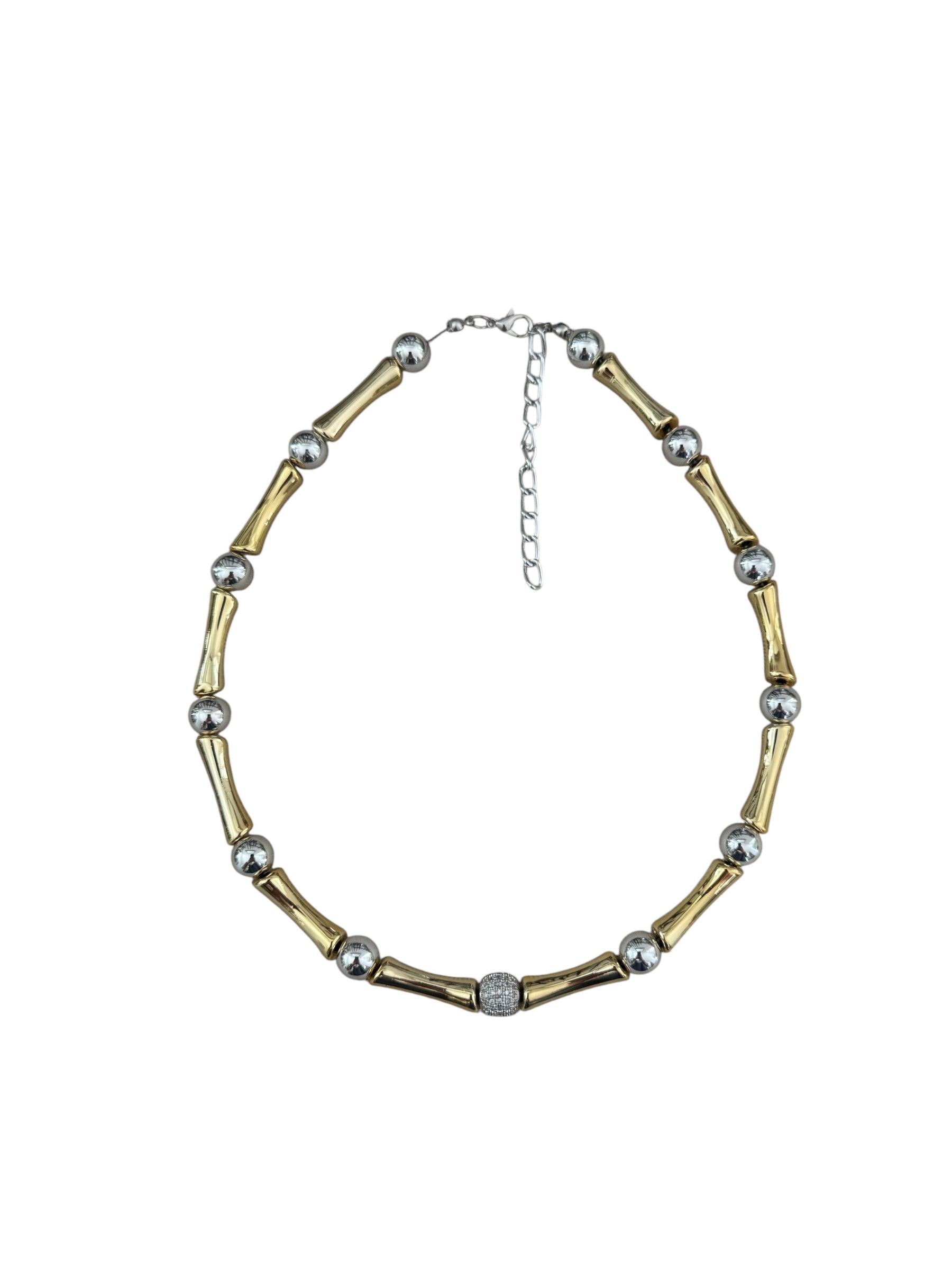 Collier perles tubes et boules en acrylique dorées, argentés et à strass.